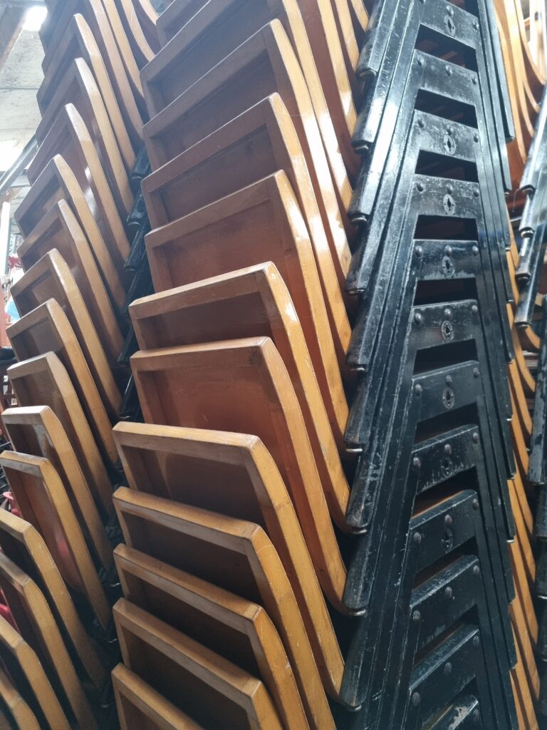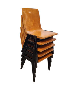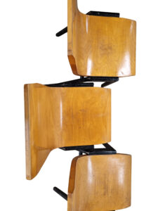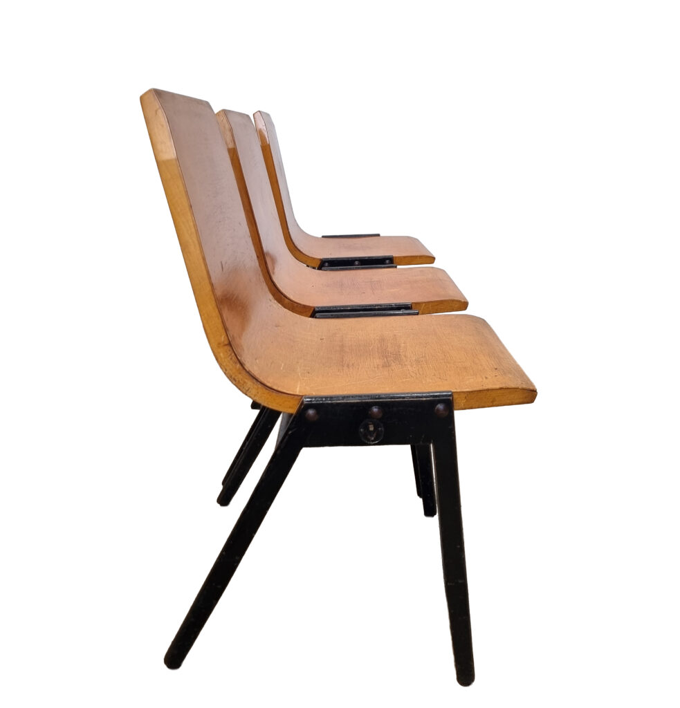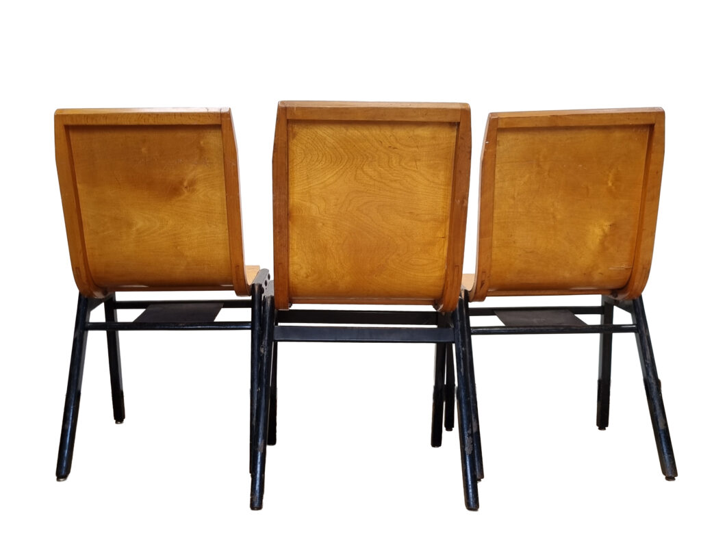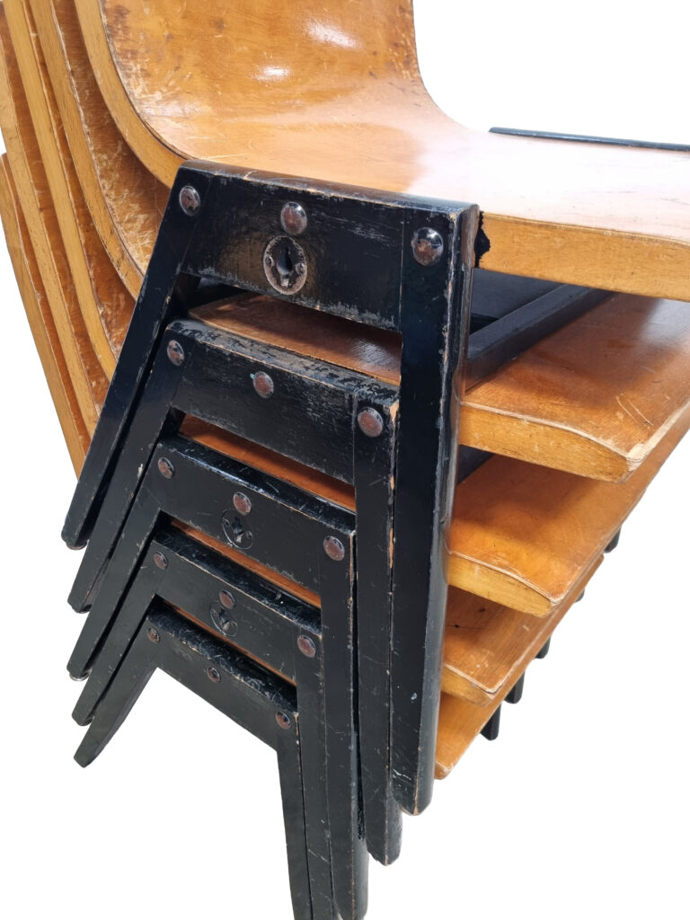 100+ Roland Rainer stapelstoelen – Wiener Stadthalle, 1952 – gebogen multiplex & houten A-frame.
