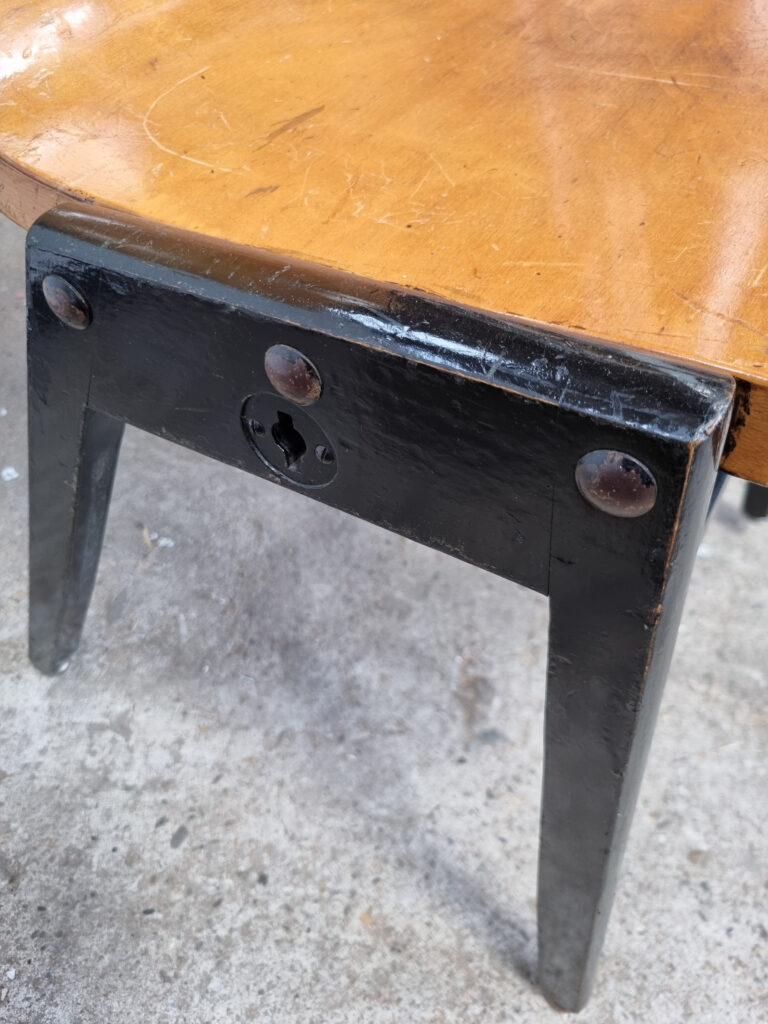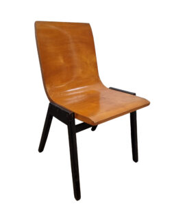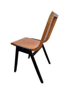 De prachtige hoek van rug en zitting is specifiek vormgegeven voor gebogen multiplex en zit verrassend comfortabel. Het herkenbare, hoekige houten A-frame contrasteert fraai met de zacht gebogen kuip: een tijdloze combinatie die zowel in interieurs als in hospitality/event-settings indruk maakt.