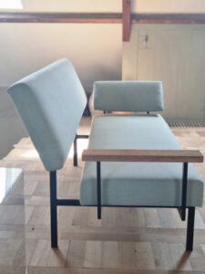 The sofa is characterized by its architectural silhouette, featuring a slim black metal frame, floating seat and backrest, and two solid wood armrests with a warm natural finish. The clean horizontal lines and light visual footprint are exemplary of post-war European modernism.