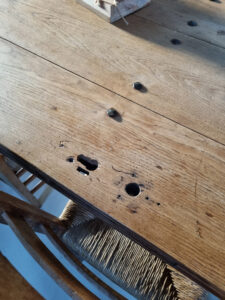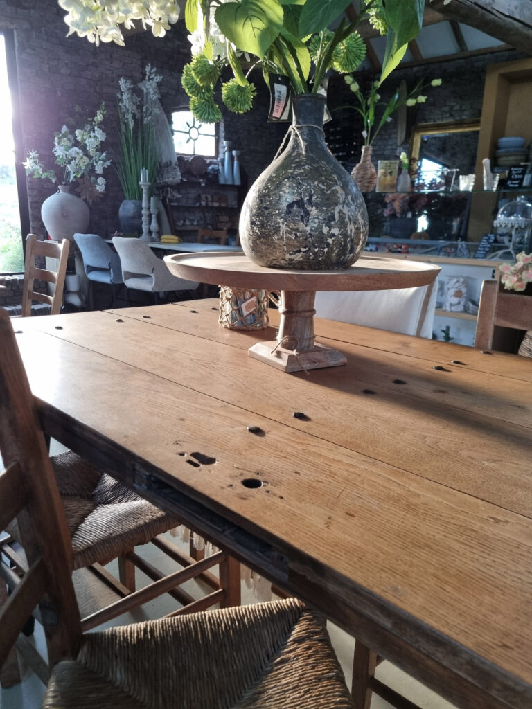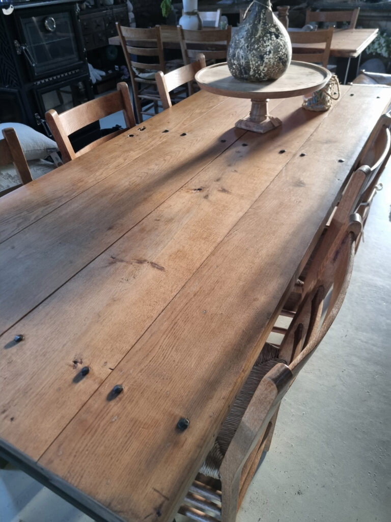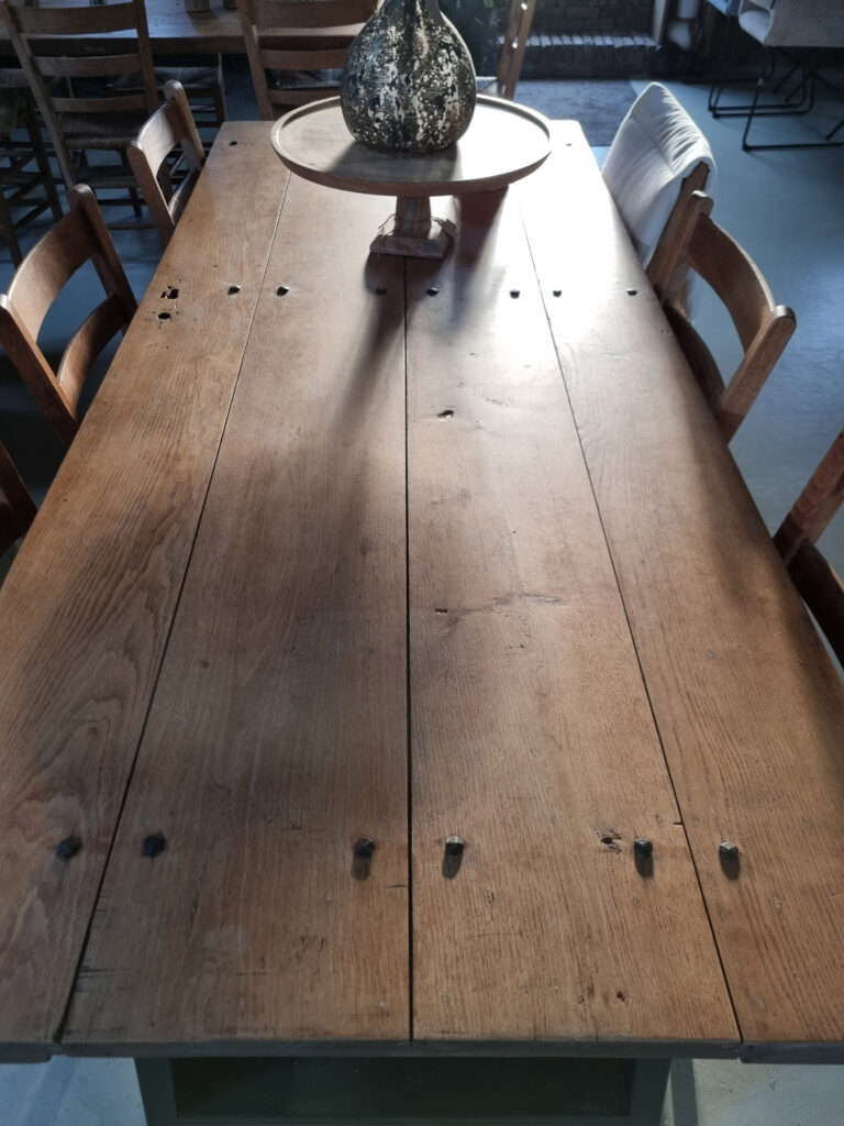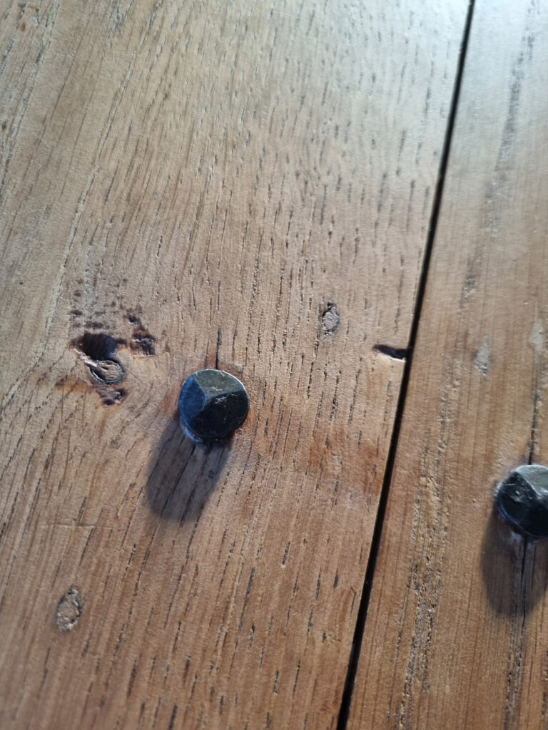 Stoer, warm en met een verhaal. Deze eettafels zijn gemaakt van massieve oude kasteeldeuren uit Kasteel Wijchen. De deurbladen zijn zorgvuldig geschuurd en 4× afgewerkt met een matte, transparante lak (onzichtbare look – wél beschermd). De handgesmede nagelkoppen en oude sleutel-/scharniergaten zijn bewust zichtbaar gelaten: precies die details geven karakter.