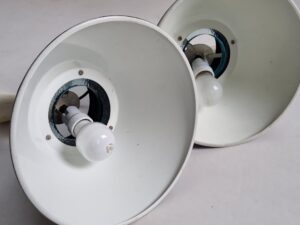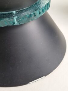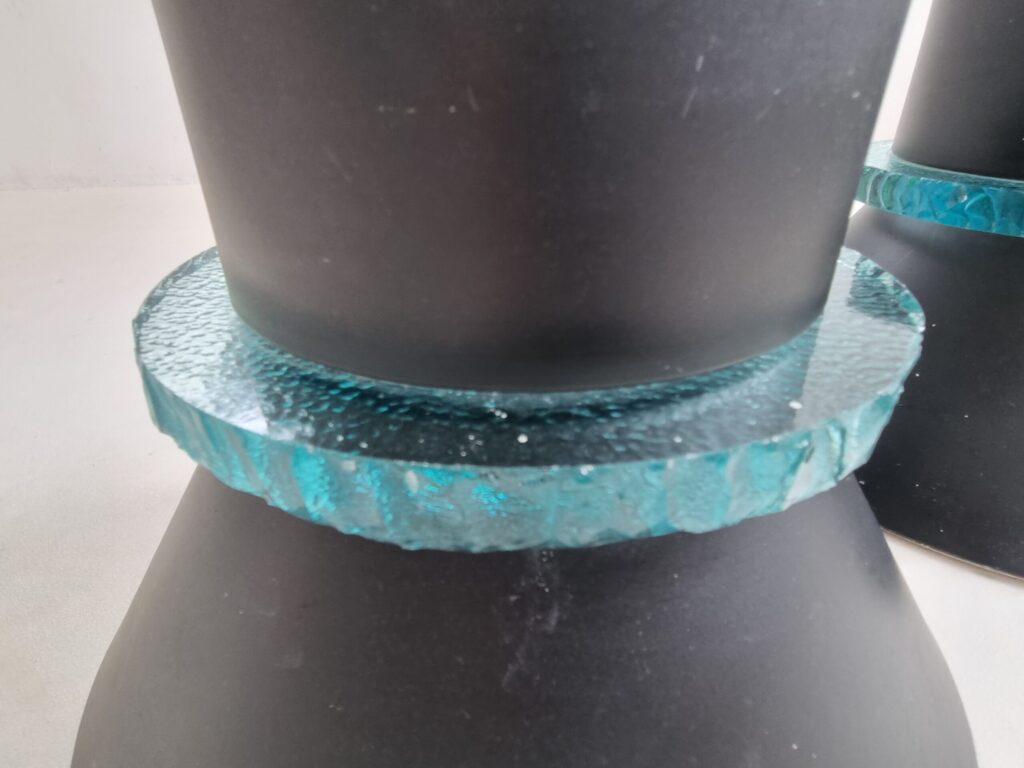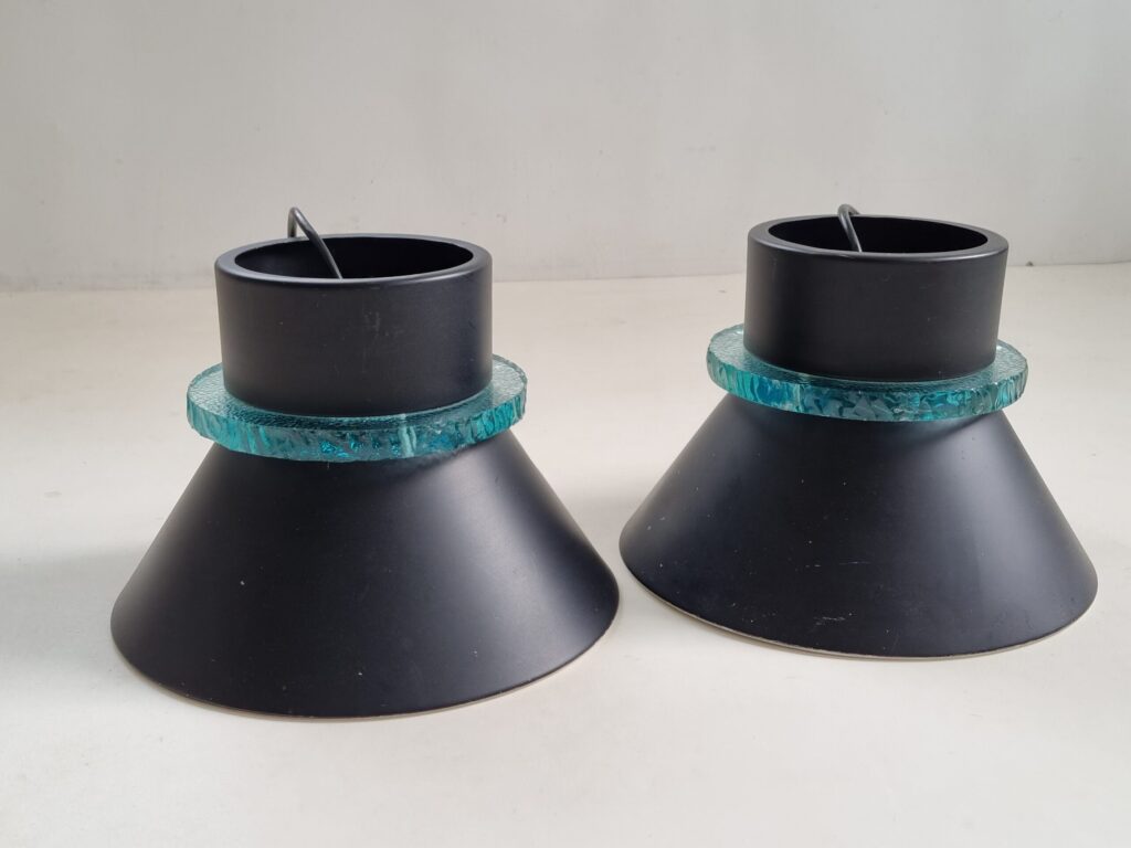 Hiemstra Evolux staat bekend om hoogwaardige Nederlandse verlichting met een uitgesproken ontwerpkwaliteit. De combinatie van deze vorm met de turquoise glasring maakt dit een zeldzame en zeer sfeervolle set, die zowel functioneel als sculpturaal is.