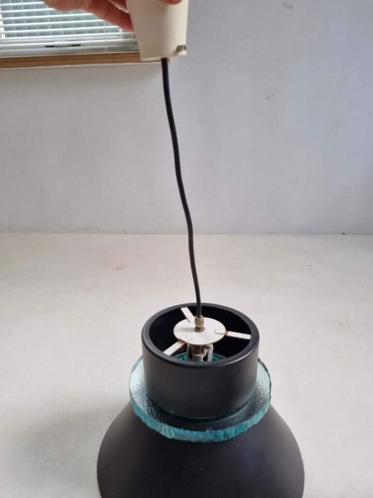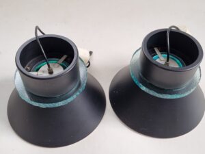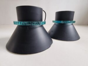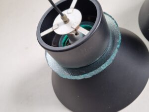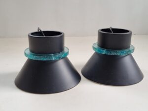 Bijzonder fraaie set van twee Nederlandse design hanglampen, geproduceerd door Hiemstra Evolux (ca. jaren 60–70). Deze lampen combineren een strak, zwart metalen silhouet met een karakteristieke dikke turquoise glasring, die een subtiele, warme lichtgloed rondom verspreidt.