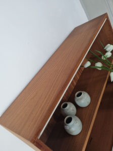 2 vintage kastjes met ribbelglas – warm hout & wit (mid-century uitstraling)