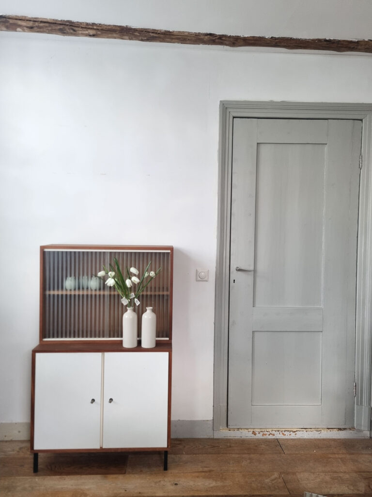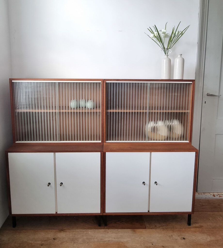 Een superleuke set van twee bijpassende vintage kastjes met een fijne, rustige uitstraling: warm houtfineer, witte fronten en bovenin ribbelglas schuifdeuren. Door het geribbelde glas zie je de inhoud subtiel (mooi “blur”-effect), waardoor het perfect is voor servies, glaswerk, boeken of styling-items.