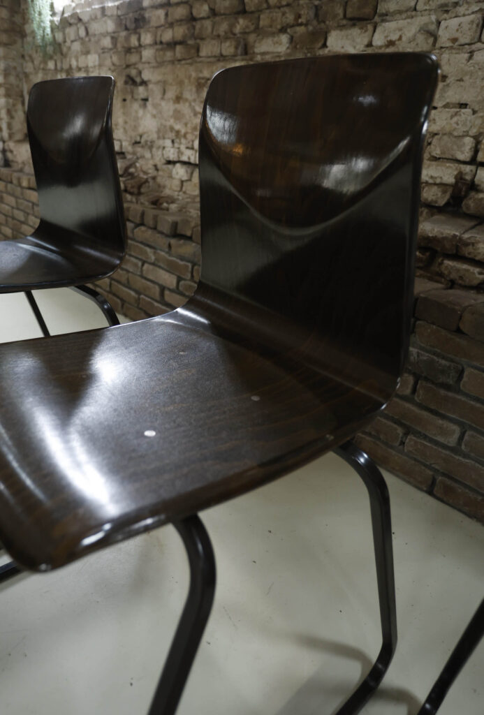 Prachtige originele Galvanitas S23 stoelen uit de jaren 60, uitgevoerd met een donkerbruine Pagholz zitting en rugleuning en een zwart metalen sledeframe.