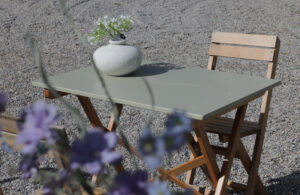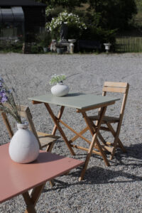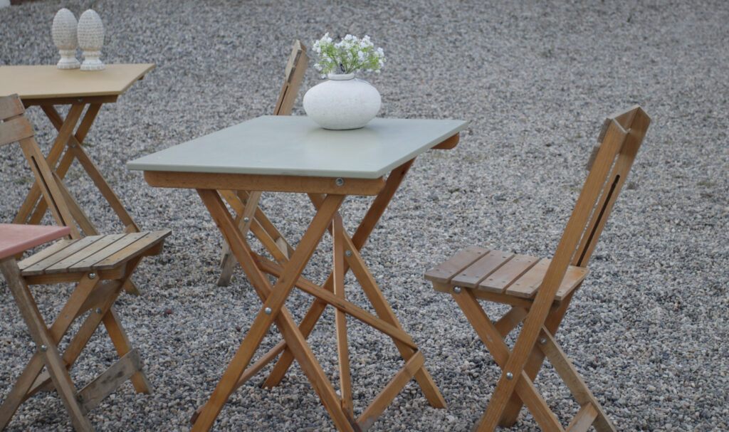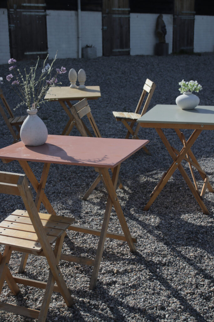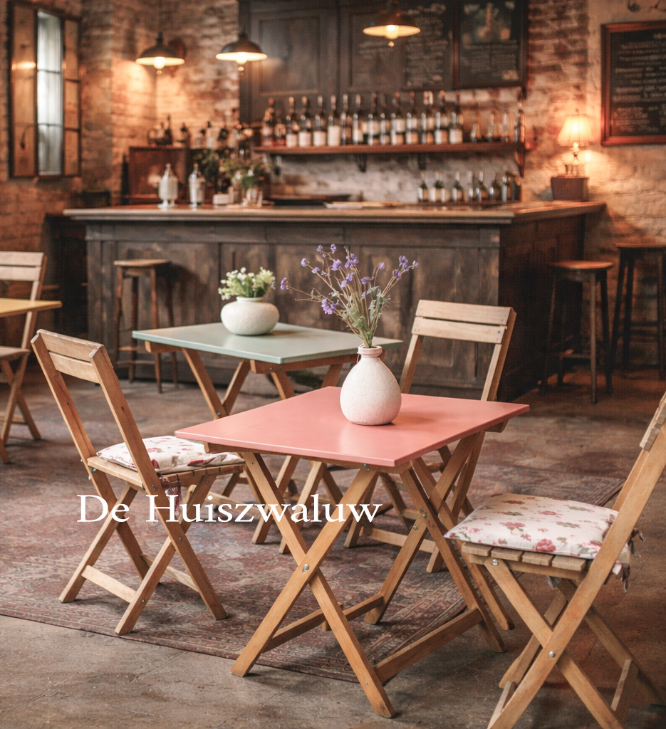 Wij hebben een grote partij vintage houten klaptafels: het tafelblad is op kleur geschilderd (alleen het blad), waardoor ze meteen rust en uitstraling geven, terwijl het onderstel zijn warme houten karakter behoudt.