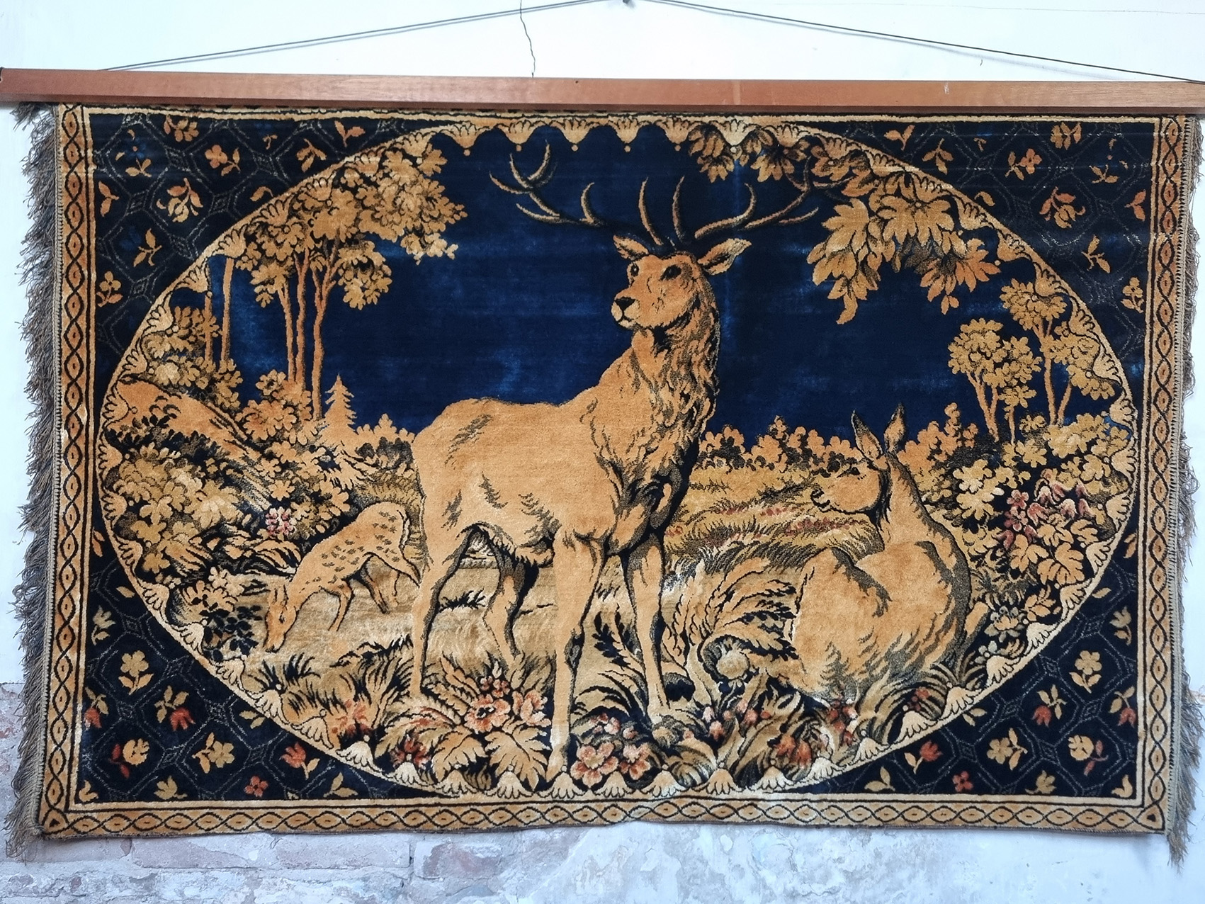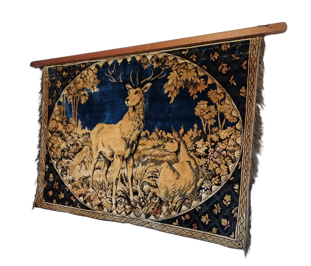 Sfeervol velours geweven wandkleed met een majestueus edelhert en twee hinden in een boslandschap. Diep nachtblauw met warme goud-/beigetinten. 185 × 123 cm.
