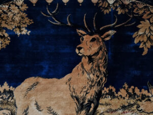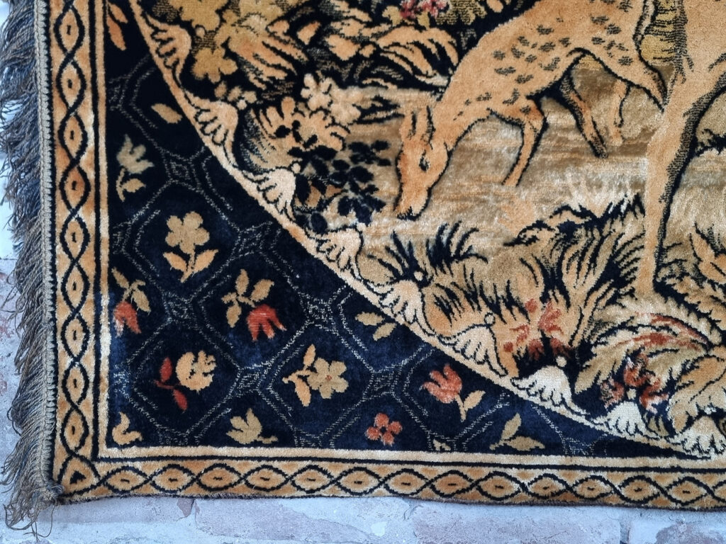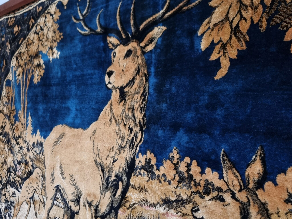 Wil je in één keer meer warmte en sfeer in huis? Dit vintage wandkleed met een rustig boslandschap doet precies dat. In het midden staat een mooi edel(hert) bok, met twee hinden eromheen. De diepe donkerblauwe achtergrond en de zachte zand- en goudtinten maken het kleed tijdloos en makkelijk te combineren.
